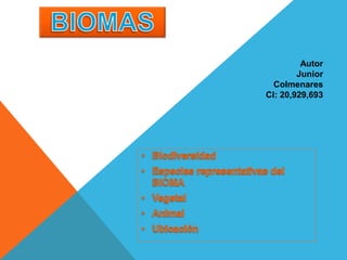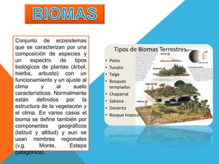 El documento describe los diferentes tipos de biomas que existen, incluyendo selvas húmedas subtropicales, bosques templados, desiertos subtropicales, sabanas tropicales, praderas de altura, selvas tropicales, sabanas, estepas, praderas, bosques templados, bosques de coníferas o taiga, tundras y selvas tropicales maga térmicas. Define cada bioma por su composición vegetal, clima y ubicación geográfica típica.