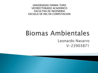 Este documento contiene información personal de Leonardo Navarro, incluyendo su número de identificación y detalles de su educación en la Universidad Fermín Toro en la Escuela de Ingeniería en Computación.