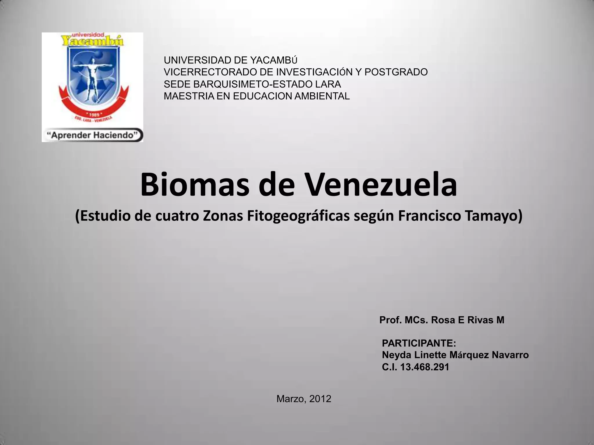 Este documento describe cuatro biomas de Venezuela: manglares, selvas tropófilas, sabanas altas de las tierras de Guayana y sabanas propiamente dichas. Se estudia la localización, clima, suelo, altitud, temperatura, precipitación, pisos altitudinales, fauna, flora, adaptaciones de los organismos y áreas protegidas de cada bioma, así como problemas ambientales.