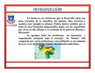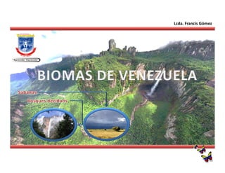 Este documento describe el bioma de los bosques deciduos o bosques secos de Venezuela. Se caracterizan por tener árboles que pierden sus hojas durante la estación seca y por tener una temperatura media anual de 25-28°C y precipitaciones menores a 1.400 mm. Algunas especies representativas son el araguaney, el jabillo y el jobo. Varios parques nacionales como El Ávila y Aguaro-Guariquito protegen este bioma.