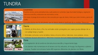 La tundra se caracteriza por fuertes vientos, pocas precipitaciones, suelo pobre en nutrientes y baja diversidad biológica. La vegetación es sencilla y de baja estatura, y las estaciones de crecimiento son cortas. La fauna incluye animales con pelaje grueso como la liebre y el oso polar.