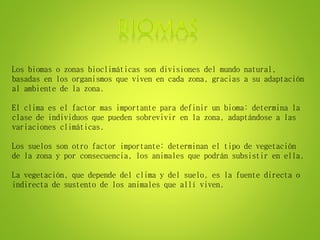 El documento describe los diferentes biomas o zonas bioclimáticas de Venezuela, incluyendo el páramo, la selva amazónica, el bosque nublado, los llanos, y el manglar. Cada bioma se caracteriza por su ubicación geográfica, clima, flora y fauna distintivas que se han adaptado a las condiciones ambientales únicas de esa zona.