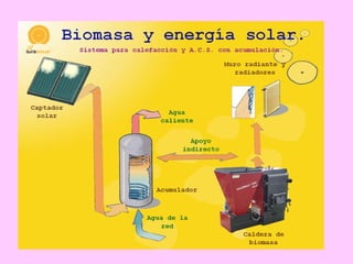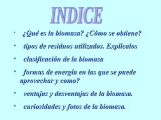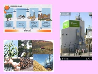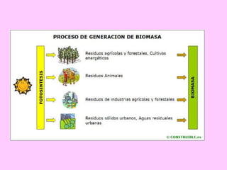 La biomasa se obtiene del procesamiento de materia orgánica de origen animal o vegetal. Puede clasificarse como biomasa natural, seca, residual húmeda o cultivos energéticos. Se utilizan residuos forestales, agrícolas, animales e industriales. La biomasa puede aprovecharse para generar energía térmica, eléctrica o mecánica. Tiene ventajas como ser renovable y no emitir CO2, pero también desventajas como baja densidad energética y costos de almacenamiento y transporte.
