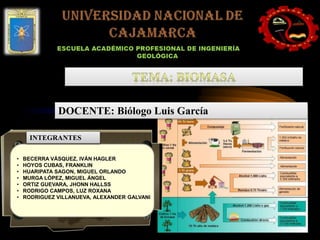 Este documento presenta la información de 7 estudiantes e introduce el tema de la biomasa como fuente de energía renovable. Describe los tipos y usos de la biomasa, el funcionamiento de los biodigestores y la importancia del biodiesel como biocombustible.