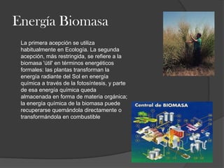 La biomasa se refiere a la materia orgánica que puede usarse como fuente de energía. Incluye biomasa natural, residual y cultivos energéticos. La biomasa natural se produce sin intervención humana, la biomasa residual son subproductos agrícolas y la biomasa de cultivos energéticos se destina a la producción de biocombustibles. La biomasa puede usarse directamente como combustible o convertirse en combustibles como bioetanol a través de procesos como la fermentación o descomposición.