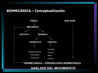 Este documento trata sobre la biomecánica y sus principios fundamentales. Explica conceptos como cinemática, cinética, fuerzas, palancas y planimetría, y cómo estos se aplican al análisis del movimiento humano. El objetivo de la biomecánica es evaluar, mejorar y crear nuevas técnicas de movimiento aplicando principios físicos para lograr un máximo rendimiento motor.