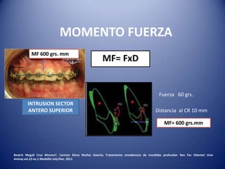 Este documento presenta información sobre principios biomecánicos en ortodoncia, incluyendo conceptos como momento de fuerza, fuerza par o torque, leyes de Newton, vectores de fuerza, suma de vectores, momento positivo y negativo, fuerzas positivas y negativas, relación momento-fuerza, y tipos de movimiento dental como inclinación, traslación y rotación. También explica el modelo de Burstone y el centro de rotación.