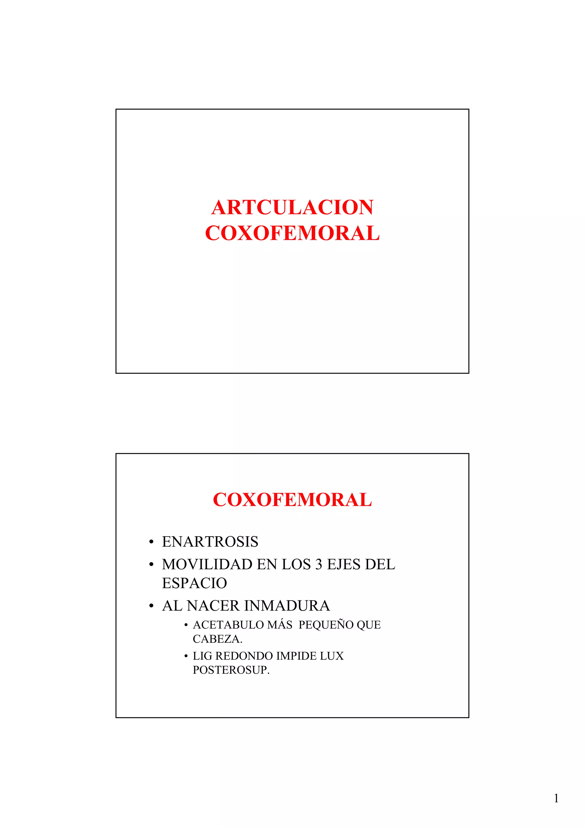 Este documento describe la articulación coxofemoral, incluyendo su estructura ósea, ligamentos, rangos de movimiento y músculos involucrados. La articulación es una enartrosis que permite el movimiento en tres ejes y está formada por el acetábulo del hueso coxal y la cabeza femoral. Está estabilizada por ligamentos y una cápsula articular reforzada, y los músculos producen la flexión, extensión, rotación y abducción/aducción de la cadera.
