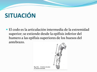 Este documento describe la anatomía del codo. Resume que el codo es la articulación entre el húmero y los huesos del antebrazo, y que permite movimientos de flexión, extensión y pronosupinación. Explica las características óseas, articulares, musculares y ligamentosas del codo, así como sus funciones y posición funcional.