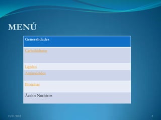 Este documento resume las principales biomoléculas que constituyen los seres vivos: carbohidratos, lípidos, proteínas y ácidos nucleicos. Explica que los carbohidratos son la principal fuente de energía y están formados por monosacáridos, disacáridos y polisacáridos. Describe que los lípidos se caracterizan por ser insolubles en agua y pueden ser simples o complejos. Finalmente, indica que las proteínas están formadas por cadenas de aminoácidos y pueden ser simples o conjugadas.