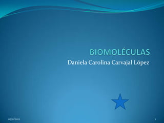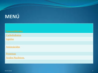 Este documento resume las principales biomoléculas que constituyen los seres vivos: carbohidratos, lípidos, proteínas y ácidos nucleicos. Explica que los carbohidratos son la principal fuente de energía y clasifica los diferentes tipos de carbohidratos, lípidos y aminoácidos que componen las proteínas. Además, describe brevemente las características y funciones de cada biomolécula.