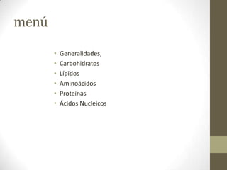Las biomoléculas son moléculas constituyentes de los seres vivos y están formadas principalmente por carbono, hidrógeno, oxígeno y nitrógeno. Incluyen carbohidratos como la glucosa que es la principal fuente de energía, lípidos que son insolubles en agua, aminoácidos que son los componentes de las proteínas, y proteínas formadas por cadenas de aminoácidos. Los ácidos nucleicos también son biomoléculas importantes.
