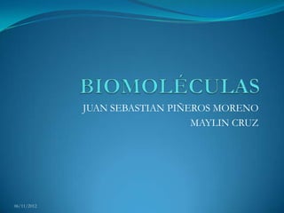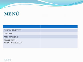 Este documento presenta información sobre las principales biomoléculas: carbohidratos, lípidos, aminoácidos y proteínas. Explica que los carbohidratos son la principal fuente de energía y están formados por monosacáridos, disacáridos y polisacáridos. Los lípidos se caracterizan por ser insolubles en agua y están formados por ácidos grasos, fosfolípidos y otras sustancias. Los aminoácidos son los componentes de las proteínas y existen 20 tipos principales. Finalmente, las proteín