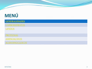 Este documento presenta información sobre las principales biomoléculas que componen los seres vivos: carbohidratos, lípidos, proteínas y ácidos nucleicos. Explica que los carbohidratos son la principal fuente de energía y que incluyen monosacáridos, disacáridos y polisacáridos. También describe las características y clasificación de los lípidos y proteínas, así como los 20 aminoácidos que forman parte de las proteínas.