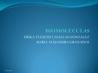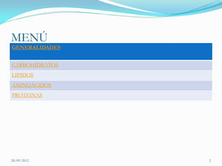 Este documento presenta información sobre las principales biomoléculas que componen los seres vivos, incluyendo carbohidratos, lípidos, aminoácidos y proteínas. Define cada tipo de biomolécula, describe sus características y clasificaciones, y ofrece detalles sobre sus funciones y propiedades químicas.