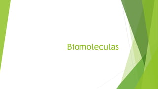 Las biomoléculas son compuestos orgánicos e inorgánicos fundamentales para los seres vivos. Se dividen en orgánicas e inorgánicas, siendo las orgánicas sintetizadas por los seres vivos y comprendiendo los carbohidratos, lípidos, proteínas, vitaminas y ácidos nucleicos. Estos cumplen funciones estructurales, energéticas y de transporte, control y almacenamiento de información genética.