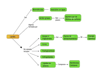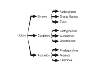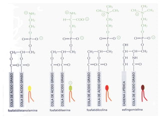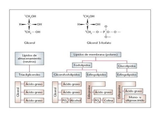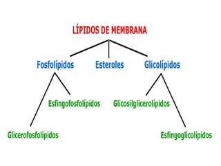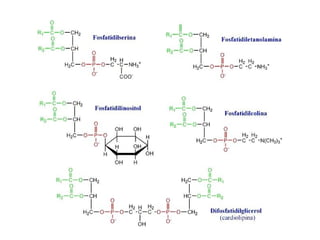 Este documento trata sobre la composición y estructura de las membranas celulares, lípidos, colesterol y ácidos nucleicos. Explica la clasificación de ácidos grasos, triacilglicéridos y saponificación. Describe las funciones del colesterol, su síntesis, fuentes y metabolismo. Además, cubre las lipoproteínas, fosfolípidos, bicapa lipídica y asimetría de membranas. Finalmente, analiza nucleótidos, bases nitrogenadas, estructuras del ADN
