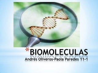 Este documento describe las principales biomoléculas (proteínas, glúcidos, lípidos, ácidos nucleicos) que componen los seres vivos. Explica que las proteínas contienen nitrógeno y están formadas por carbono, oxígeno, hidrógeno y nitrógeno; los glúcidos por carbono, hidrógeno y oxígeno; los lípidos por carbono e hidrógeno; y los ácidos nucleicos por azúcares, ácido fosfórico y bases nitrogenadas. Además, detalla