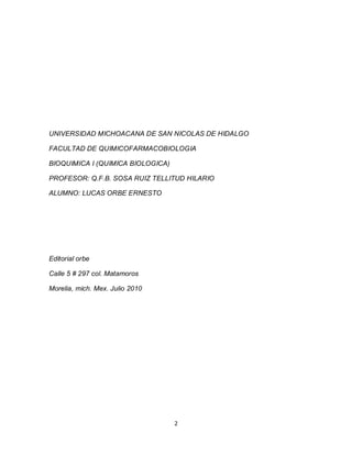Este documento presenta un resumen de tres capítulos de un libro de texto sobre bioquímica. El primer capítulo introduce el concepto de bioquímica y las biomoléculas principales. El segundo capítulo cubre los ácidos nucleicos, incluidos los tipos y el código genético. El tercer capítulo trata sobre las proteínas, incluidos los aminoácidos, las clasificaciones de proteínas y las enzimas.