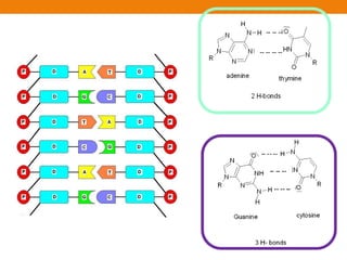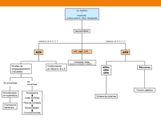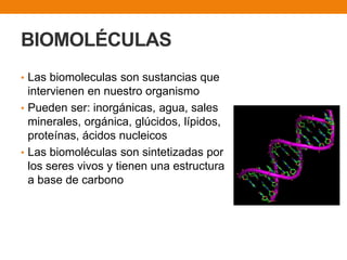 Este documento describe las biomoléculas más importantes como el ADN, ARN y ATP. Explica que el ADN almacena y transmite la información genética a través de los cromosomas. Está compuesto de nucleótidos formados por una base nitrogenada, azúcar y grupo fosfato. El ARN también está formado por nucleótidos y cumple funciones como la síntesis de proteínas.