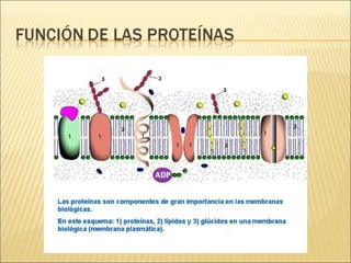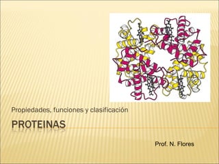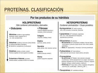 El documento aborda las propiedades, funciones y clasificación de las proteínas, destacando su solubilidad y desnaturalización, así como su especificidad funcional y de especie. Se menciona que las proteínas son esenciales para diversas funciones biológicas y su estructura puede verse afectada por factores como la temperatura y el pH. También se discuten ejemplos específicos de proteínas y su relevancia en procesos biológicos y enfermedades.