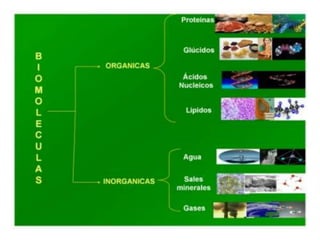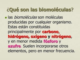Las biomoléculas son moléculas producidas por organismos vivientes y están compuestas principalmente de carbono, hidrógeno, oxígeno y nitrógeno. Se dividen en biomoléculas inorgánicas como el agua y sales minerales, y biomoléculas orgánicas como lípidos, glúcidos, proteínas y ácidos nucleicos que son sintetizadas por seres vivos.