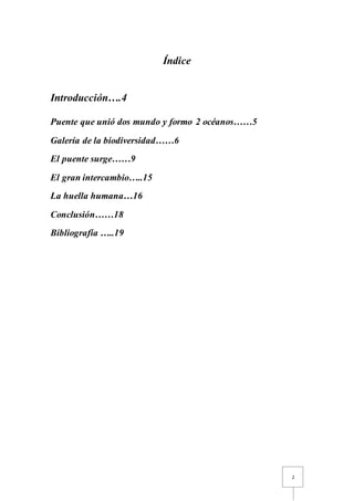 El documento describe la visita guiada al Biomuseo de Panamá. Explica cómo Panamá emergió hace 3 millones de años como un puente entre Norte y Suramérica, permitiendo el Gran Intercambio Americano de especies. También detalla las exhibiciones sobre la biodiversidad de Panamá, la formación geológica del istmo, y el impacto humano a lo largo de la historia que dividió los océanos Pacífico y Atlántico.