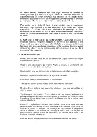 Este documento describe el tema de la microscopía. Explica la historia del microscopio, sus partes principales y cómo se usa. También incluye objetivos del laboratorio, procedimientos realizados y conclusiones sobre las observaciones al microscopio de líneas, palabras y papel milimetrado.
