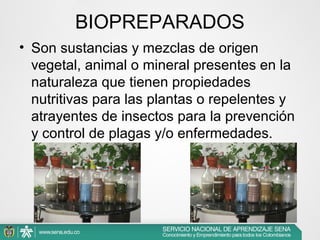 El documento describe los biopreparados, que son sustancias de origen vegetal, animal o mineral con propiedades nutritivas o de control de plagas. Explica las ventajas y desventajas de los biopreparados, como su bajo costo, menor toxicidad y desarrollo más lento de resistencia, pero también su bajo efecto residual. Además, clasifica los biopreparados y describe métodos como extractos, decocciones y purines para prepararlos, con ejemplos como el extracto de manzanilla y el caldo bordalés. Finalmente
