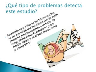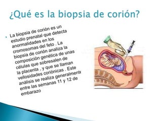 El documento describe dos tipos de procedimientos para realizar una biopsia de corión: por vía transvaginal o transabdominal. La biopsia de corión se usa para detectar defectos en las extremidades del feto o el riesgo de aborto espontáneo y generalmente se realiza sin anestesia por vía transvaginal introduciendo una sonda o pinza, aunque a veces se hace por vía transabdominal con anestesia.