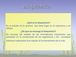 La bioquímica estudia las reacciones químicas que ocurren en los organismos y células. Se encarga del análisis de importantes biomoléculas como los carbohidratos, lípidos, proteínas, vitaminas y minerales que participan en la construcción de los organismos y en la regulación de los sistemas moleculares que controlan la vida. Los carbohidratos incluyen monosacáridos como la glucosa y fructosa, disacáridos como la sacarosa y lactosa, y polisacáridos como el almidón