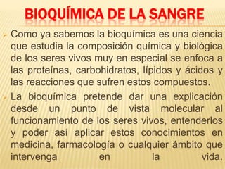 Este documento resume conceptos clave de bioquímica sanguínea. Explica que la sangre está compuesta de elementos formes como eritrocitos, leucocitos y plaquetas, dispersos en el plasma. Describe las principales proteínas plasmáticas y sus funciones en el transporte de nutrientes, defensa del organismo y mantenimiento del equilibrio hidroelectrolítico. También cubre alteraciones patológicas comunes y parámetros bioquímicos usados para monitorear la función hepática, renal y enfermedades como diabetes e hipertens