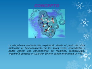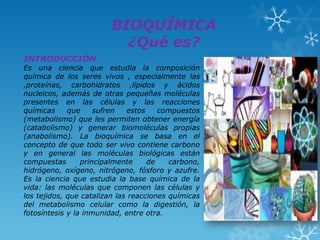 La bioquímica estudia la composición química de los seres vivos, especialmente moléculas como proteínas, carbohidratos, lípidos y ácidos nucleicos. Examina las reacciones químicas que permiten a los organismos obtener energía y generar biomoléculas. La bioquímica busca dar una explicación molecular del funcionamiento de los seres vivos y aplicar este conocimiento en medicina y otras áreas.