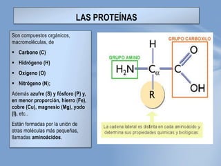Las proteínas son macromoléculas formadas por la unión de aminoácidos. Cumplen múltiples funciones en los organismos como estructural, hormonal, defensiva, reguladora, catalítica, de transporte y almacenamiento. Las proteínas más numerosas son las enzimas, que actúan como biocatalizadores de las reacciones químicas del metabolismo celular. Otras proteínas importantes incluyen la hemoglobina, que transporta oxígeno en la sangre, y el colágeno, que forma parte de tendones,