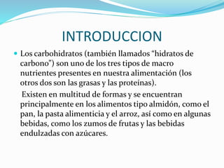 Los hidratos de carbono son uno de los tres principales macronutrientes junto con las grasas y las proteínas. Se clasifican en monosacáridos, oligosacáridos y polisacáridos. Cumplen funciones importantes como proporcionar energía al cuerpo y se encuentran principalmente en alimentos como cereales, frutas, leche y sus derivados, legumbres y tubérculos.