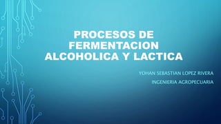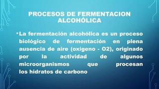 Este documento describe dos procesos de fermentación: la fermentación alcohólica y la fermentación láctica. La fermentación alcohólica es un proceso anaeróbico realizado por levaduras que convierten azúcares como la glucosa en alcohol y dióxido de carbono. La fermentación láctica es también un proceso anaeróbico donde bacterias lácticas oxidan parcialmente la glucosa para producir energía y ácido láctico como subproducto. Ambos procesos son importantes en la producción de alimentos y be