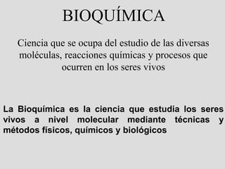 La bioquímica estudia los seres vivos a nivel molecular mediante métodos físicos, químicos y biológicos. Se ocupa del estudio de las moléculas, reacciones químicas y procesos que ocurren en los seres vivos. Tiene como objetivo comprender todos los procesos químicos relacionados con las células vivas a nivel molecular.