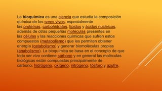 La bioquímica estudia la composición química de los seres vivos, especialmente proteínas, carbohidratos, lípidos y ácidos nucleicos. Examina las reacciones químicas del metabolismo celular como la digestión, la fotosíntesis y la inmunidad. También integra las leyes químico-físicas y la evolución biológica para entender los biosistemas y sus componentes a nivel molecular, aplicando este conocimiento a sectores como la medicina, la agricultura y la farmacología.
