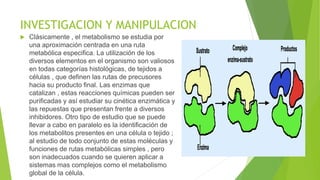 El documento describe dos enfoques clásicos para estudiar el metabolismo: estudiando rutas metabólicas específicas y purificando enzimas, y identificando metabolitos presentes en células y tejidos. También explica que la ingeniería metabólica aplica esta información para modificar genéticamente organismos como levaduras y bacterias con el fin de hacerlos más útiles para la biotecnología mediante la producción de drogas, antibióticos u otros químicos, reduciendo el uso de energía y desechos en el proceso.