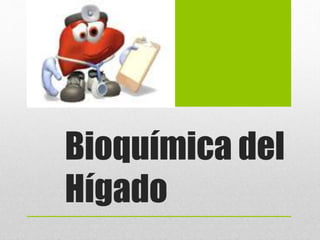 El documento resume las principales funciones del hígado, incluyendo: 1) la transformación y almacenamiento de glucógeno y lípidos por los hepatocitos, 2) el metabolismo de carbohidratos, lípidos, proteínas, y la producción de bilis, 3) la inactivación y desintoxicación de compuestos xenobióticos y metabolitos a través de enzimas como el citocromo P450.