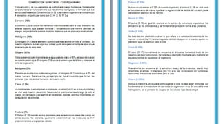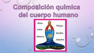El documento resume los principales elementos que componen el cuerpo humano, incluyendo oxígeno (65%), carbono (18%), hidrógeno (10%), nitrógeno (3%), calcio (1.5%), y fósforo (1%). También menciona los oligoelementos más importantes como potasio, azufre, sodio, magnesio, cloro, hierro y yodo, y brevemente describe su importancia o función en el cuerpo.