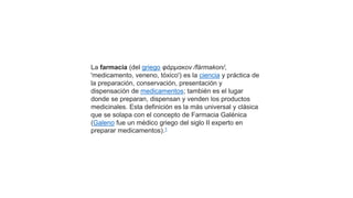 La farmacia es la ciencia y práctica de preparar, conservar, presentar y dispensar medicamentos. Antiguamente, un farmacéutico preparaba los medicamentos, pero ahora la industria farmacéutica se encarga de la elaboración, aunque los farmacéuticos aún investigan y coordinan la formulación.