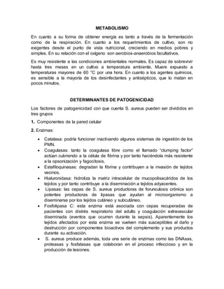 El documento describe las características metabólicas, factores de patogenicidad y resistencia antibiótica de Staphylococcus aureus. S. aureus obtiene energía a través de la fermentación y respiración, crece en medios pobres de forma aerobia o anaerobia facultativa, y es resistente a temperaturas menores a 60°C. Produce diversas enzimas y toxinas como catalasa, coagulasa y hemolisinas que contribuyen a su patogenicidad. Puede desarrollar resistencia a antibióticos como meticilina mediante la produ