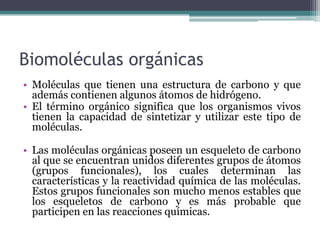 Este documento presenta información sobre biomoléculas orgánicas como glúcidos y lípidos. Explica que los glúcidos son moléculas formadas principalmente por carbono, hidrógeno y oxígeno que cumplen funciones energéticas y estructurales en los organismos. Se clasifican en monosacáridos, oligosacáridos y polisacáridos. Los lípidos son moléculas formadas por cadenas de carbono e hidrógeno que cumplen funciones de reserva energética y estructural.