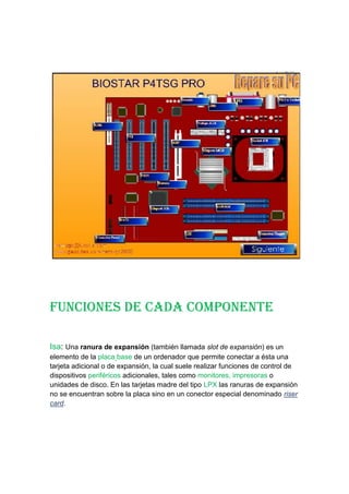 El documento describe los diferentes componentes de una placa base de computadora, incluyendo ranuras de expansión, buses PCI y AGP, conectores como CNR y AMR, el voltaje ATX, memoria SDRAM, el BIOS, unidades floppy, el chipset ICH, zócalos, e interfaz MIDI.
