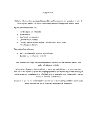 Este documento presenta un resumen biográfico de Edar Edenilson Cáceres Rivera, un joven de 17 años con varias habilidades como escribir rápido, manejar motos y usar computadoras, además de ser amable y atento. También menciona algunos detalles negativos como que le molesta la desobediencia y que solo unos pocos se esfuercen. El joven ha planificado metas y su vida para progresar a pesar de que su estructura de vida es complicada y sus planes son difíciles.