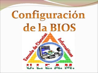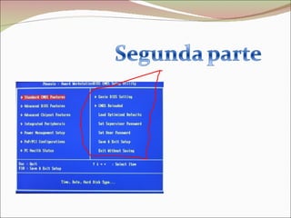 El documento describe las diferentes opciones de configuración disponibles en la BIOS de una computadora, incluyendo la habilitación de controladoras y puertos, ajustes de dispositivos de almacenamiento y periféricos, y opciones para restaurar valores predeterminados o establecer contraseñas de acceso a la BIOS.