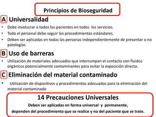 Este documento presenta los principios de bioseguridad, incluyendo las precauciones universales que deben aplicarse en el cuidado de la salud. Describe 14 precauciones universales como lavado de manos, uso de descartadores de elementos cortopunzantes, eliminación de desechos contaminados, uso de barreras de protección personal, inmunización del personal de salud y denuncia obligatoria de accidentes. También clasifica los materiales utilizados en la atención médica como críticos, semicríticos o no críticos y establece los