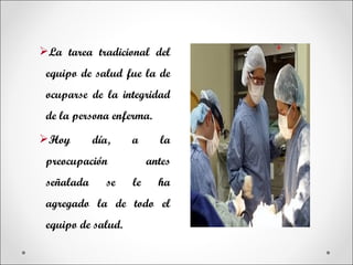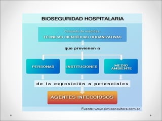 Este documento trata sobre bioseguridad en el ámbito de la salud. Explica que la bioseguridad incluye normas y medidas preventivas para proteger la salud de las personas en ambientes hospitalarios de microrganismos potencialmente patógenos. Sus objetivos son reconocer riesgos, prevenir infecciones intrahospitalarias, accidentes laborales y aplicar precauciones estándar como el uso de barreras físicas y químicas.