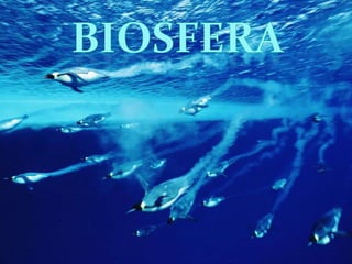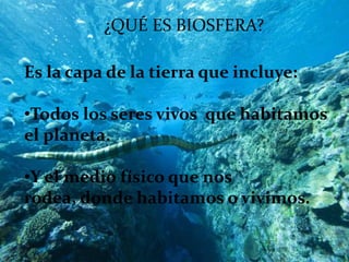 La biosfera se refiere a la parte viva de la Tierra e incluye a todos los seres vivos y su medio físico. Está compuesta por la litosfera, hidrosfera y atmósfera, e integra elementos bióticos como plantas, animales y humanos, y elementos abióticos como la energía solar, gases, agua y suelo. Juntos forman múltiples ecosistemas que crean el hábitat y cadena alimenticia para el desarrollo de la vida en el planeta.